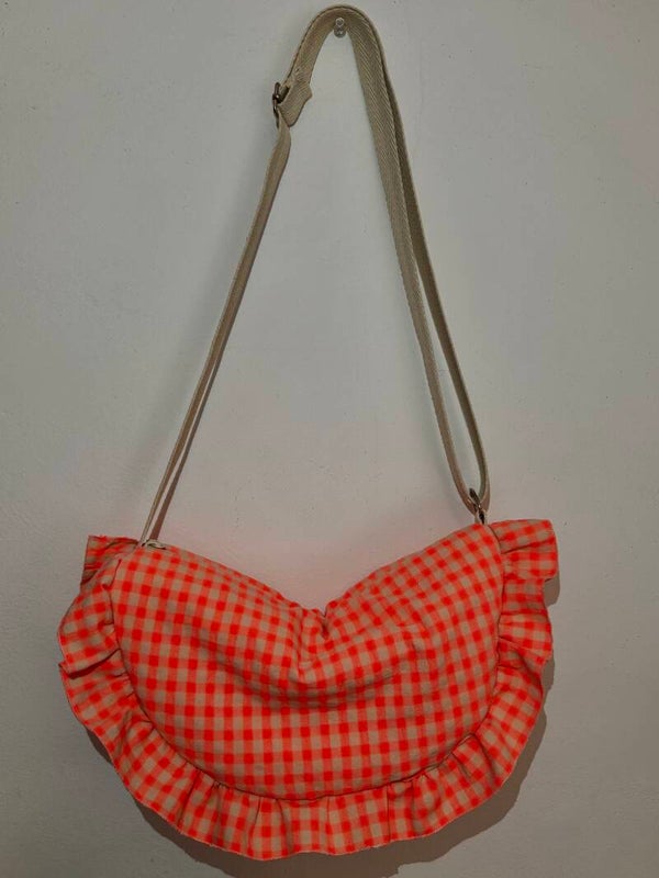 Confeccionado a mano en tela vichy en tono naranja, destaca por su forma original y su delicado volante que le aporta ese toque especial que lo hace único.
